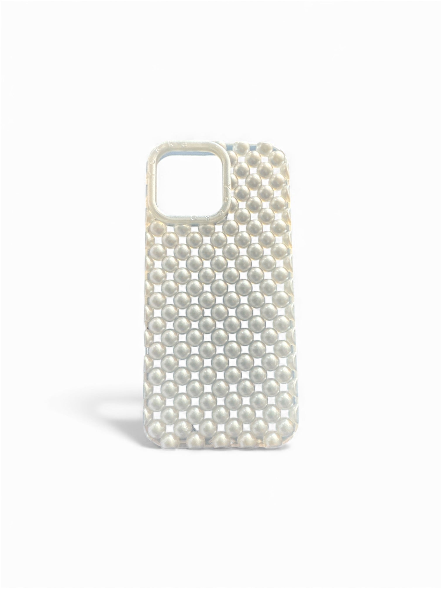 Funda con textura 3D de perlas mate iridiscentes, rígida pero ligera, agarre firme y diseño limpio sin saturación. Superficie resistente a rayones y golpes, no se pela, no pierde brillo y protege cámara con borde elevado. Look minimal joyero, sin volumen extra en el teléfono y sin pérdida de sensibilidad en botones.