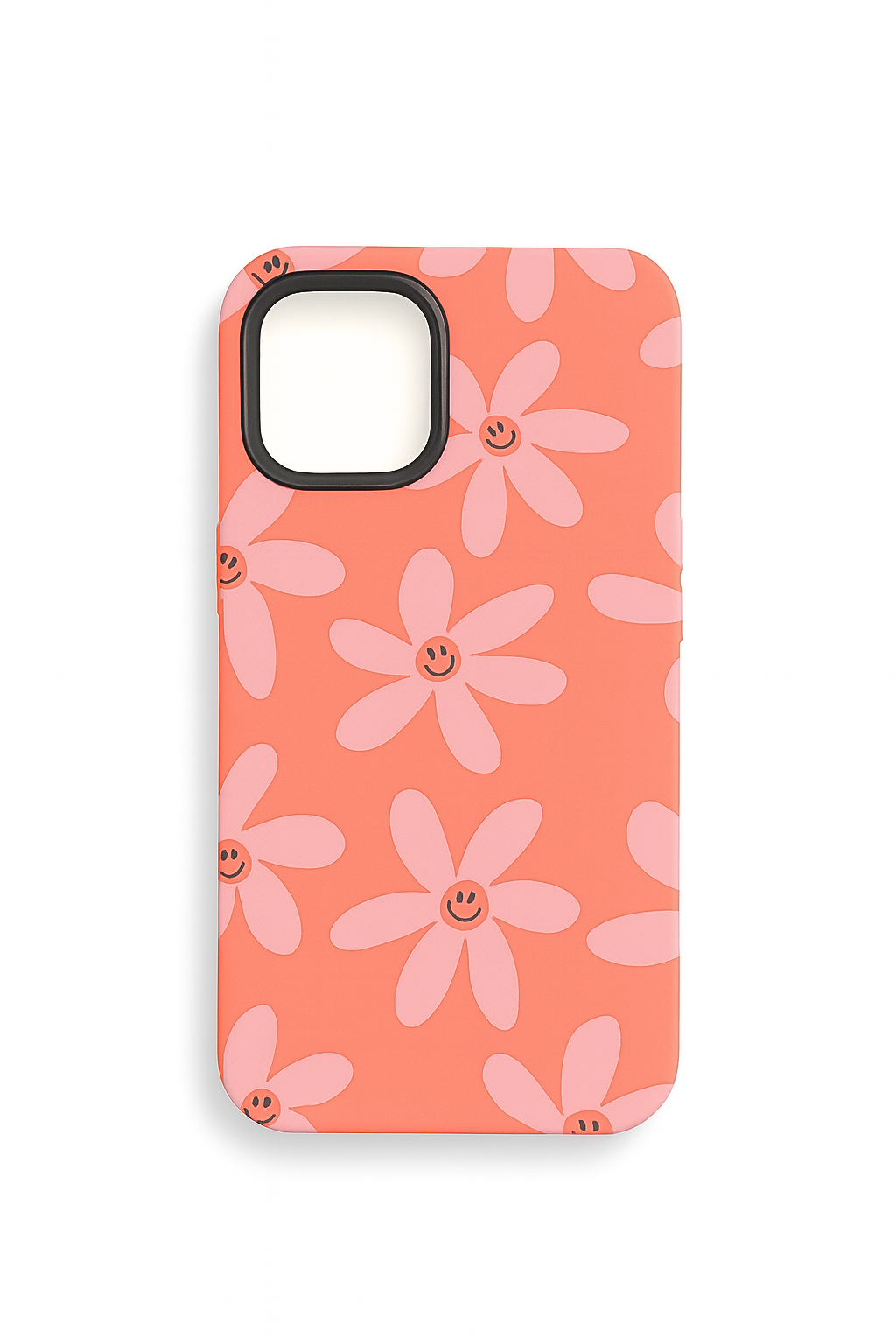 Funda rígida con acabado soft matte en tono coral con flores pink Smile Bloom en impresión HD. Superficie suave al tacto, bordes reforzados y marco elevado para cámara que garantiza protección real sin perder estética pop.